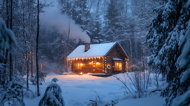 Cozy log cabin glowing in snowy forest twilight with lantern and smoke