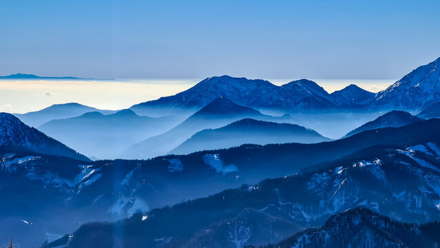 Panoramic view on snow capped mountain peaks of Karawanks in Carinthia, Austria. Julian Alps. Winter wonderland in the Austrian Alps, Europe. Ski tour, snow shoe hiking. Hochobir. Blue misty hills.