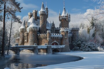 A medieval castle built on icy terrain, surrounded by frozen waterways and historic walls in a European setting.