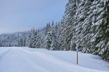 on the pole there is a direction arrow with the inscription Christmas against the backdrop of a winter forest, sunny day