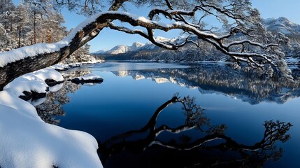 Snow-covered branches creating intricate winter pattern