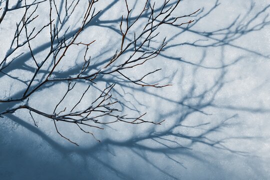 Bare tree branches cast intricate shadows on a pristine, sparkling blanket of snow, creating a serene winter scene.