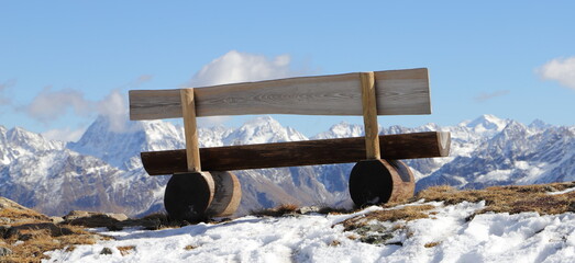 an empty bench in the snow on the mountain in tyrol