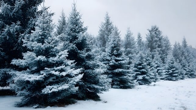 A picturesque winter forest landscape filled with dense snow covered evergreen trees under a soft overcast sky