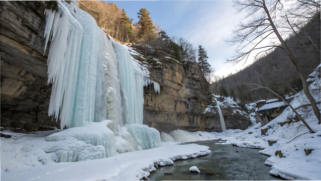 Majestic frozen waterfall cascades down a rugged cliff face into a snow covered gorge with a partially frozen river flowing through the winter landscape