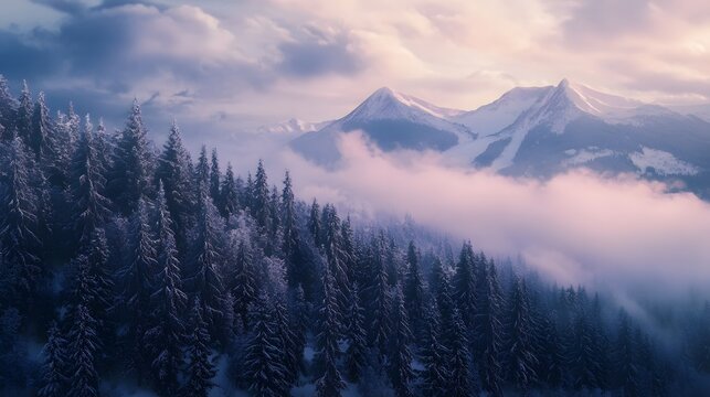 Serene winter landscape with a snow covered forest at the base of a majestic cloud shrouded mountain range against a dramatic cinematic sky