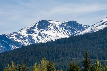Winter wonderland scenic snow covered pine trees with majestic mountains in background under a sunny blue sky