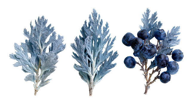 Three varied juniper species with snow covered needles and rich scale foliage on transparent background
