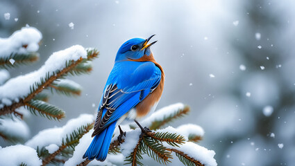 Vibrant blue bird singing on a snow covered pine branch in winter