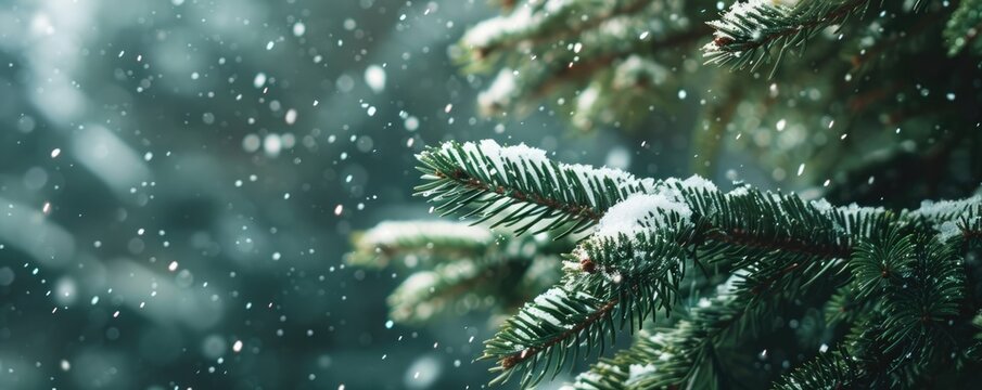Winter landscape wallpaper with pine forest covered with snow and scenic sky at sunset. Snowy fir tree in beauty nature scenery. Christmas and new year greeting card background