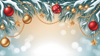 Christmas garland with red and gold ornaments festive decoration with snow covered pine branches holiday bac