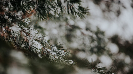 Christmas frosted pine tree branches with snow background, snowy bokeh background for a festive atmosphere.