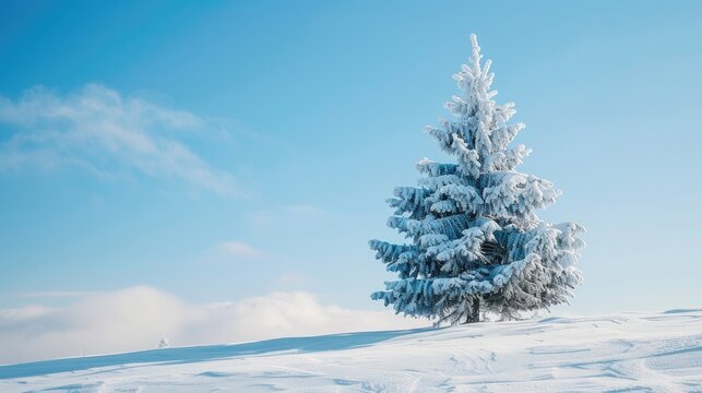 Pine tree covered in snow against blue sky on mountain top