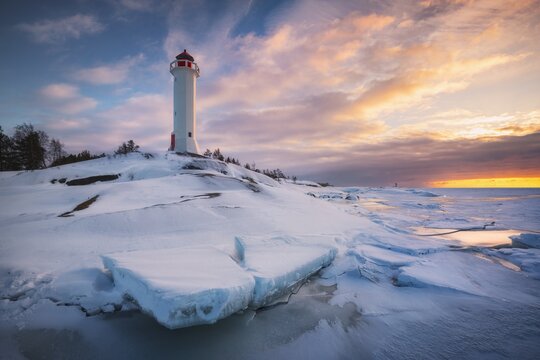 Graceful white lighthouse staying on the rocky coast covered with snow and ice at sunset. Russia, Leningrad oblast, Gulf of Vyborg