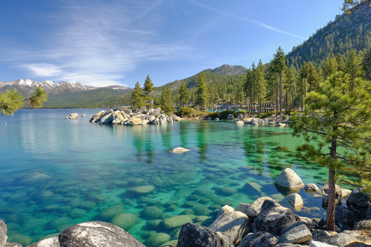 Granite boulders and trees line the pristine shoreline of Lake Tahoe with the snow covered Sierra Nevada Mountains in the background
