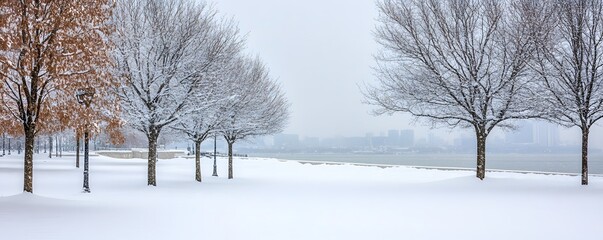 Pastel hoarfrost winter landscape with snow-covered trees, quiet shoreline, soft horizon