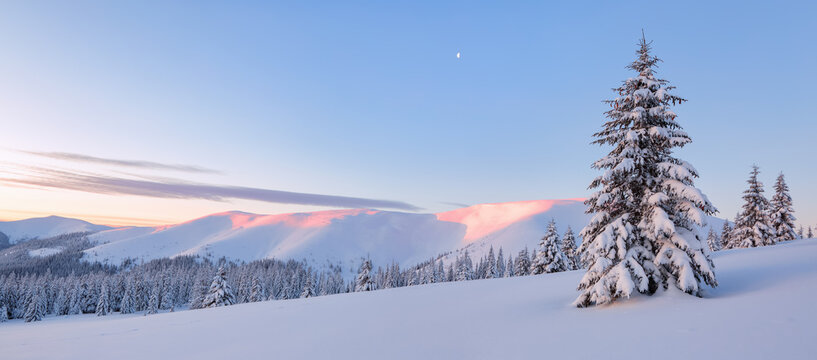 Awesome sunrise. A panoramic view of the covered with frost trees in the snowdrifts. High mountains with snow white peaks. Winter forest. Natural landscape with beautiful blue sky.