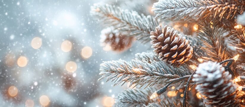 Festive holiday scene with lit candles and snow dusted pine cones on evergreen branches against a soft light bokeh background