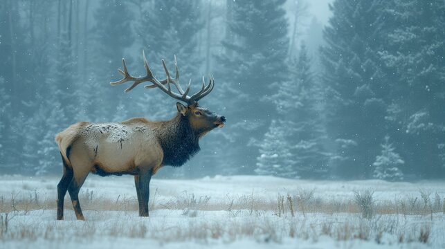 A large elk stoands in a snow-covered field, surrounded by pine trees and dusted with snow