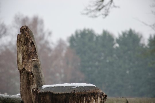 An old wooden stump in the forrest has a covering of snow as does all the landscape in Missouri on this cold winter day. Slight bokeh effect.