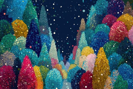 Whimsical forest of colorful textured trees under a dark starry night sky with falling snow