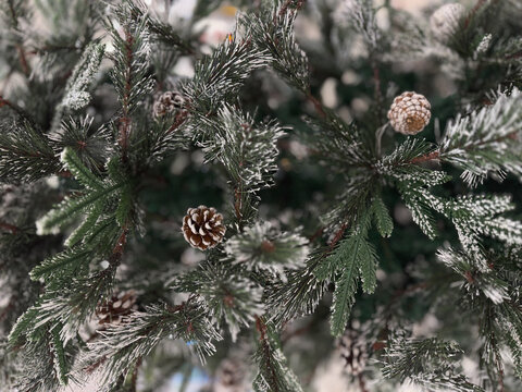 Close-up of artificial Christmas tree branches with small pine cones