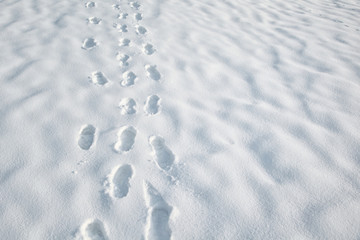 Footprints in the snow at sunny day.