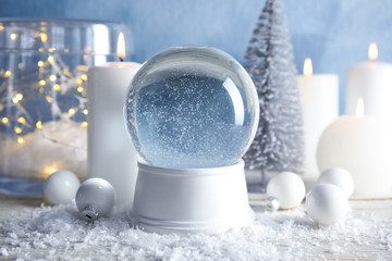 Magical empty snow globe with Christmas decorations and candles on table