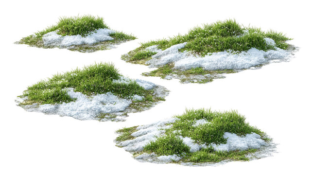 Isolated green grass meadows with melting snow realistic winter thaw patches clean cutout on transparent background for seasonal design landscaping scenes and nature visuals
