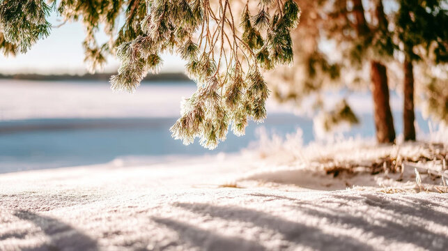 Frosty pine needles sparkling with ice and snow under warm morning sun, casting long shadows on winter ground