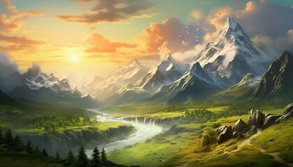 Serene mountain landscape with snow-capped peaks and lush green valley