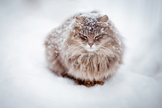 Fluffy cat on the snow snowbound