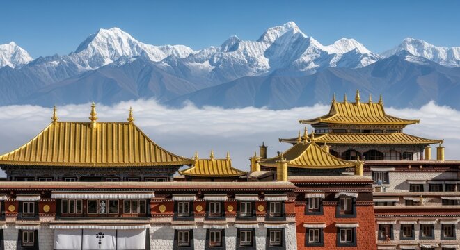Tibetan monastery with golden roofs against the backdrop of snowcapped himalayan mountains
