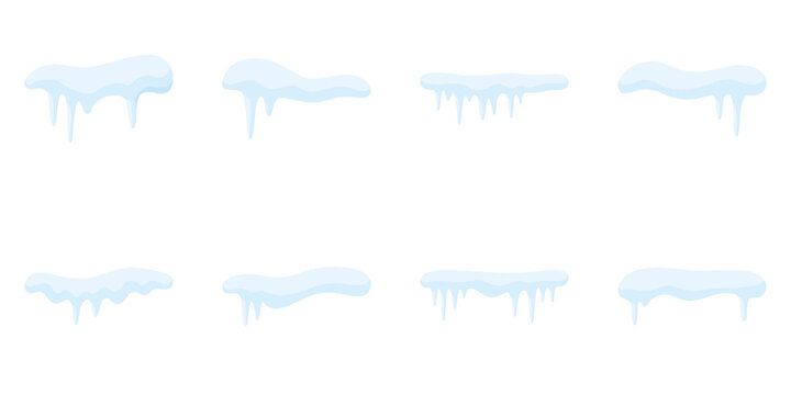 Cold new year, christmas. Winter season background. Snow caps, snowy ice and frozen icicles, vector cartoon icons, isolated on transparent background. Winter Icicles and Snow Caps Illustration Vector.