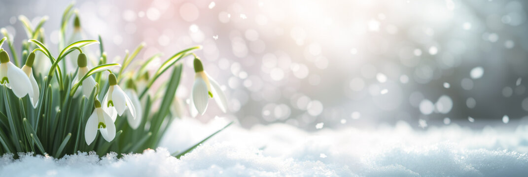 Panorama of snowdrop flowers (Galanthus nivalis) growing in the snow at the beginning of spring