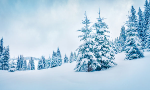 Frosty winter morning in mountain foresty with snow covered fir trees. Bright outdoor scene, Happy New Year celebration concept. Artistic style post processed photo. Orton Effect.