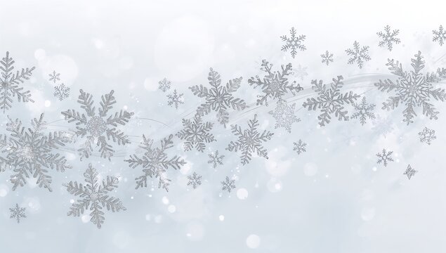Drifting decorative silver-gray snowflakes sweeping across pale blue backdrop, with glitter texture
