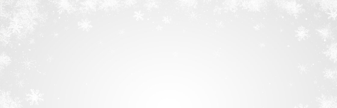 Snowy winter frame with falling snowflakes on grey background