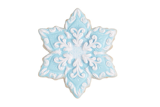 snowflake cookies with snow decoration made of cream and sugar, decorated and ready to eat.