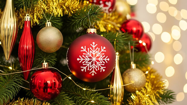 Festive christmas ornaments with falling snowflakes