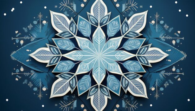 Stunning close up of a real snowflake resting on snow crystals against a dreamy blue background