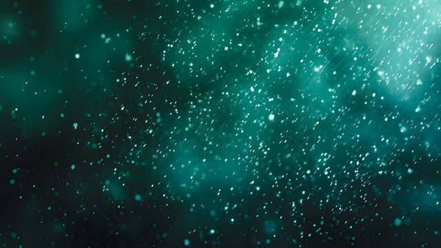 Abstract background with falling snowflakes and sparkling particles in shades of teal and blue