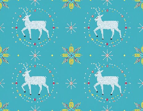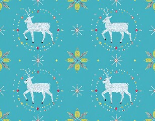A repeating pattern of white deer, outlined with small, colorful embellishments, framed by decorative snowflakes, set against a teal background.