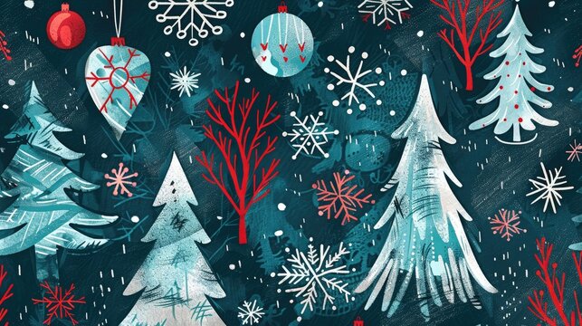 Hand drawn stylized holiday decorations featuring trees snowflakes and ornaments