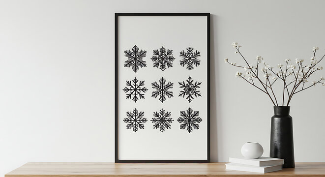 Winter minimalist wall art with abstract snowflake patterns in black and white, framed and hung on a light wall