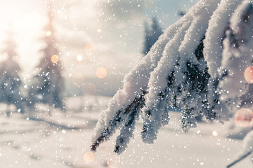 Christmas background with fir branches covered with snow, winter holiday. Beautiful snowy spruce trees in frozen mountains landscape in blurred background. Happy New Year card, bokeh, light, snowflake