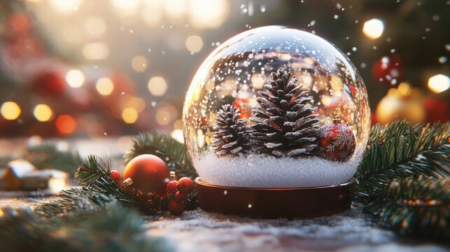 A charming snow globe captures a cozy house surrounded by pine trees. The warm light from the windows contrasts with falling snowflakes. Ideal for holiday themes and winter decor. AI