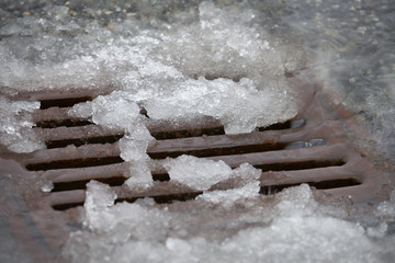 Storm Drain Snowmelt. Heavy rain pours into a storm drain during snowmelt.