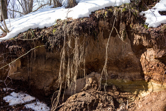 Sliding of a clay slope in a ravine during snowmelt in spring