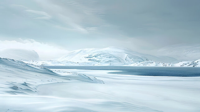 A windswept snowy plain with distant low hills under a colorless sky feels vast and desolate, embodying the emptiness of winter in a minimalist way, the image is rendered in HD with